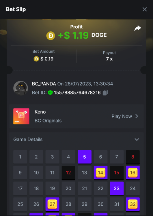 $5,000 Exclusive KENO Prestige Challenge #99 DURATION: 28th JULY - 4th AUGUST 12:30 pm UTC Hello VIPs! We're delighted to greet you all. This week, we have something truly special lined up for you - the Keno and Keno Multiplayer challenge with a fantastic prize pool of $5,000! The challenge will be held from 28th July to 4th August, starting at 12:30 UTC. Be sure to carefully read all the terms and conditions below to learn how you can participate in this exciting event. Best of luck to everyone! What's the Challenge? Complete as many of the following 22 payouts on either KENO or KENO Multiplayer. Must be a exact multiplier. | 5.10x | 7x | 8x | 11x | 17x | 26x | 30x | 56x | 63x | 81.5x | 100x | 180x | 250x | 270x | 350x | 450x | 500x | 600x | 710x | 800x | 900x | 1000x Each payout you hit above counts as 1 point (Maximum 1 point for each payout). If there is a tie, the player with the higher average bet amount (in USD) shall be the winner. How to Enter To enter, copy the link of the bet you'd like to submit. Once you've copied it, paste it as a reply to this thread like so: Link: https://bc.game/#/sd/11ES4BYXRW2I5J In the same post, upload a screenshot of your win by clicking the game ID WITH VIEW IN USD mode ENABLED (accessible at the bottom of dropdown menu for your wallet up top. This way, we can ensure that your bet indeed met the minimum requirement at the time of placing it: Link: https://bc.game/#/sd/11ES4BYXRW2I5J Minimum Level Minimum VIP 4 with phone verified will be eligible! Minimum Payouts Hit at least 3 payouts to qualify Minimum Bet Size $0.20 USD equivalent Eligible Coins All cryptocurrencies are eligible (excepting JB, and BCL) Available Prizes GENERAL TERMS Minimum VIP 4 with phone verified will be eligible! Minimum bet is $0.20 Please combine all of your hits together in a SINGLE post. Edit your existing post for additional hits, don't create a new post. Bets must be posted within 24 hours of placing bet in order to keep things fair for everyone. Bets must be made during the specified time window stated above. This thread will lock automatically when the time period is over. One (1) entry per household. Anyone found attempting to win multiple prizes will be disqualified from this challenge as well as all future challenges. Failure to follow instructions will result in your submission being null and void. By entering this challenge, you acknowledge that BC.Game has the final decision on results and placement. Payouts will be distributed after the event is finished. Please note that it could take up to 7 days after the completion of the event.