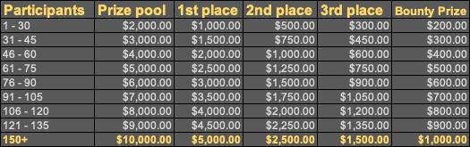 4. Here are the results! We had a total of 97 valid entries meaning the total prize pool was a whopping $7,000! 1st place -2664x - Erifyli wins $3,500! 2nd place -1961x - Alphonse wins $1,750 3rd place - 1587.5x - Aksyen12 wins $1,050 50x Bounty - exactly 50x! - LemaK wins $700 BIG BIG CONGRATS TO ALL THE WINNERS!!!