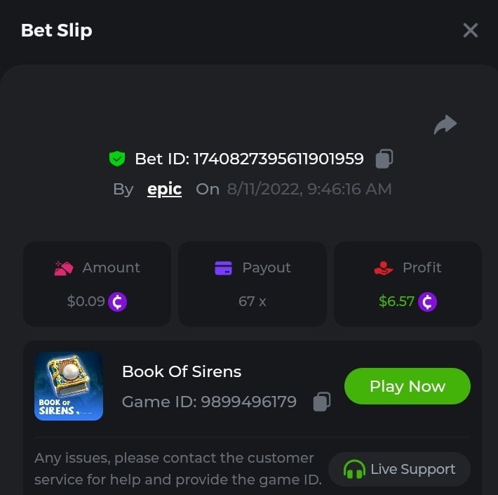 https://bc.game/sd/?sd=10QLKE348NBITV I bet 0.10$ and the min. Bet for sirens is 0.10$ no 0.09$. I guess by the time I shot it bcd value went down and it shows 0.09$. Anyway rounding off makes it 0.10$