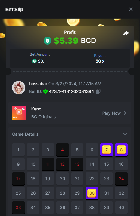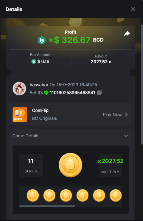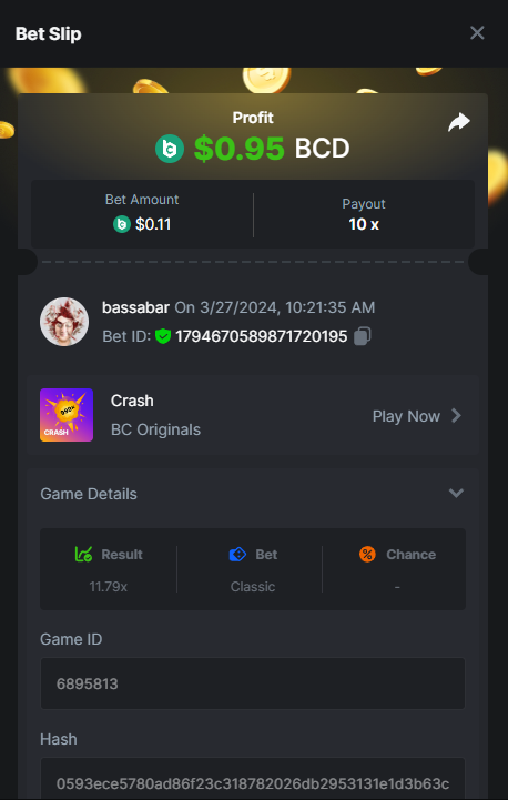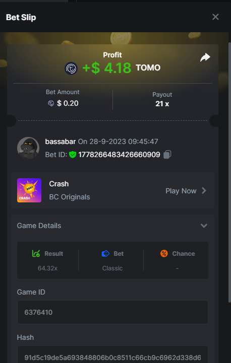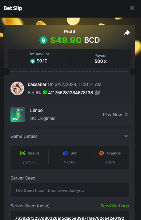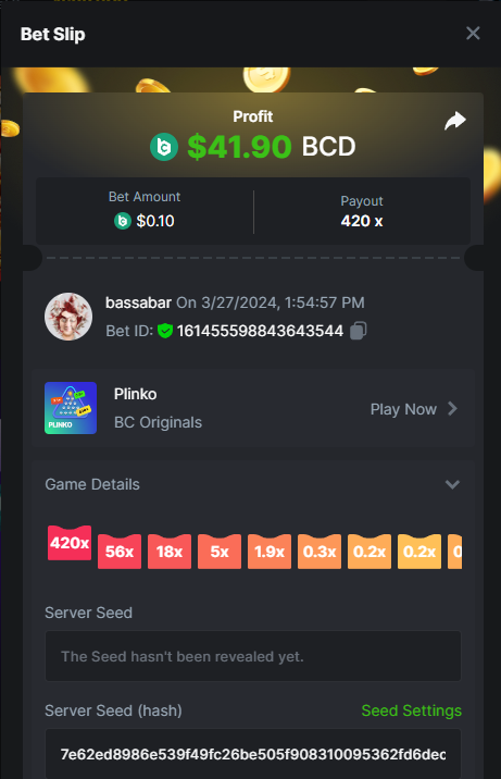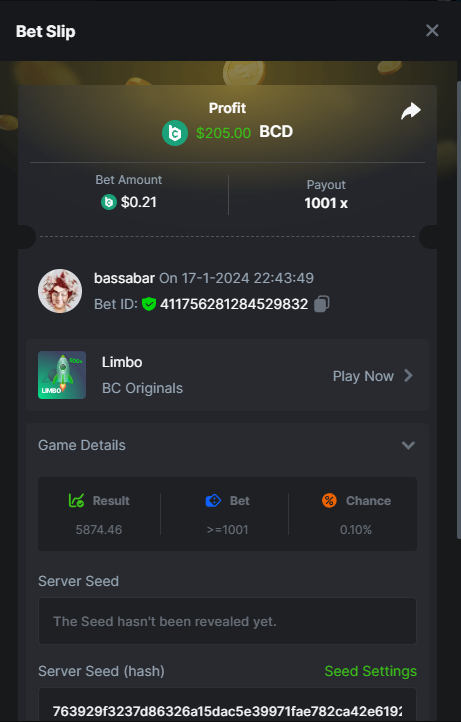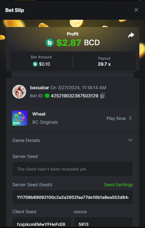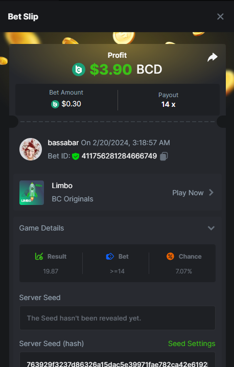 17. @BCGame_Maxim I assume the Game ID has to be consecutive too, otherwise you need to check if there was't any losing bets in between? :
