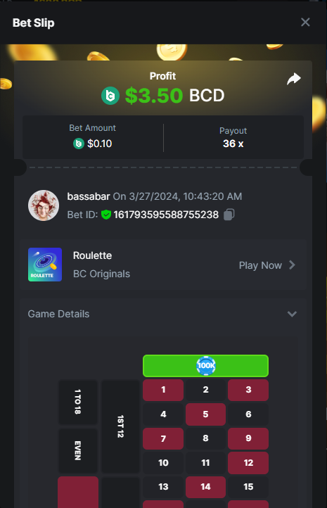 18. 5 in a row red 1. https://bc.game/#/sd/11H3646062FC47 2. https://bc.game/#/sd/11H368IXEVNFG3 3. https://bc.game/#/sd/11H369R3MQL7UB 4. https://bc.game/#/sd/11H36AJFD0UPKJ 5. https://bc.game/#/sd/11H36BQ9NEEZG3 My bets: History: