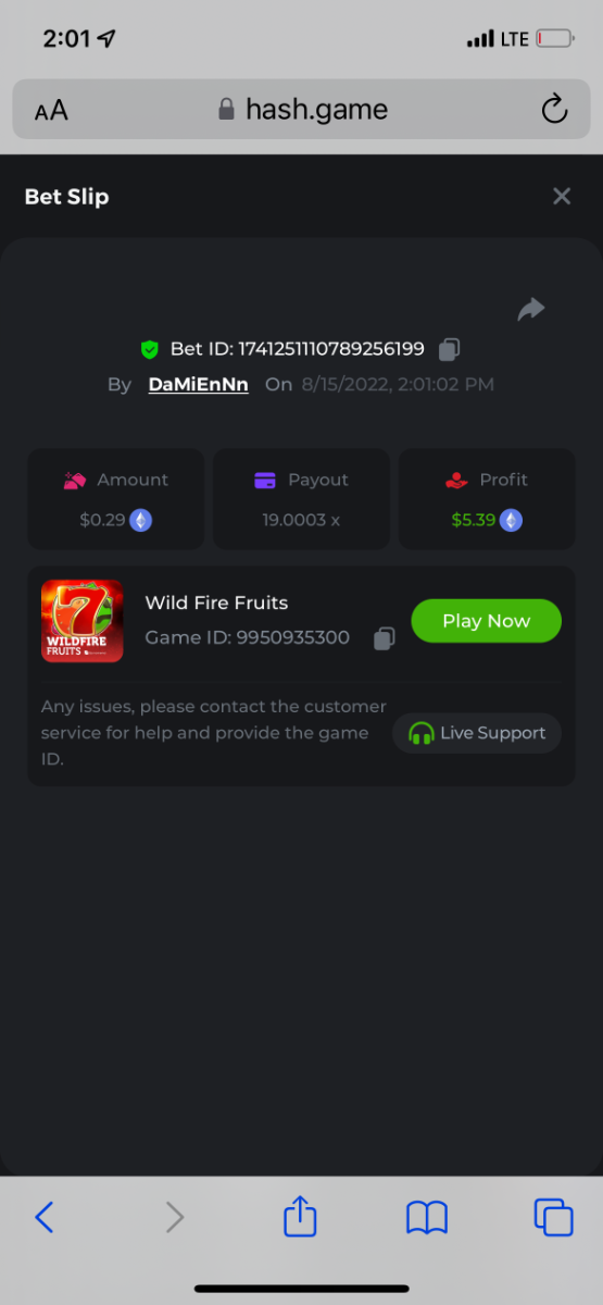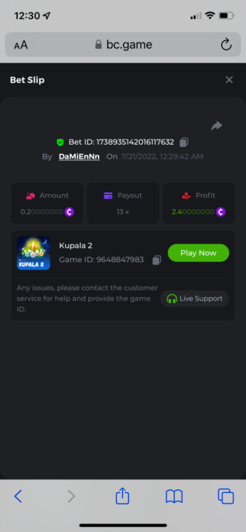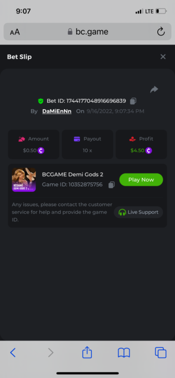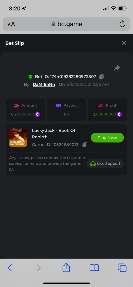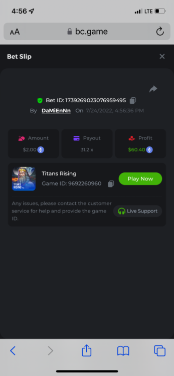 25. Titans Rising https://bc.game/sd/?sd=10PEXXTEQ58U1F 31.2x $2.00 bet Kupala 2 https://bc.game/sd/?sd=10P5T6ZOI0PPUB 13x $0.20 bet Book of wolves https://bc.game/sd/?sd=10PBU4A2VKP1XV 200x $0.10 bet The Ankh Protector https://bc.game/sd/?sd=10PE7NMH3BRSWJ 27.2002x $0.50 bet please note below comment for bounty. *****bc.game keeps lagging and freezing so i lost the link to the bet below. had to copy the bet ID number from transactions in wallet and paste here. it was a 50X exact multiplier on a $0.10 bet = bountyyy Book Of Wolves - Full Moon-Win 9677891831 7/23/2022, 10:49:03 AM