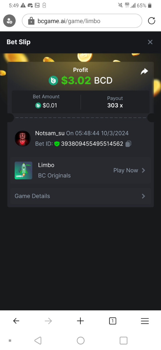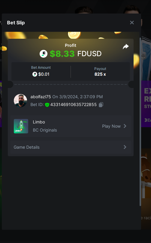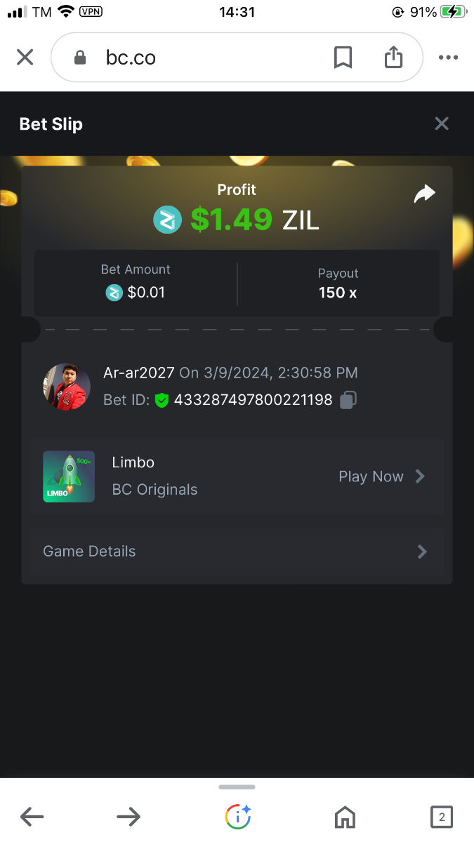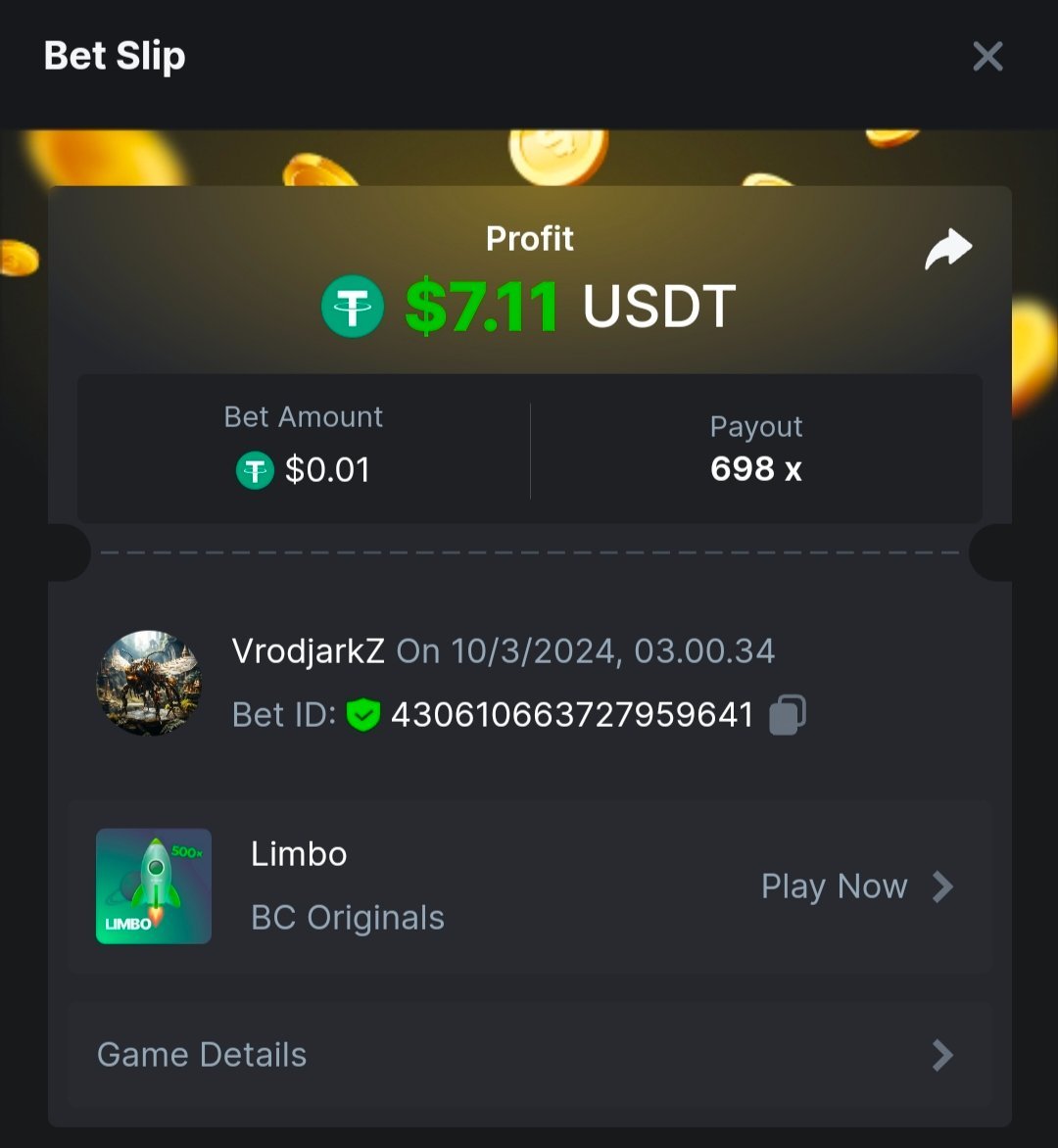Moderator Giandreas Posted March 9, 2024 Moderator Share Posted March 9, 2024 Read Carefully Before Start To Hunt Forum Daily Challenges #534Hunt : Limbo Win the highest pay out Min Payout : 50x Min Level 10 ️Duration Starting : Now End time : 23.59 UTC Time How to Join? Make screenshot + paste your bet link + UID or Profile link Any coin, with min bet 0.01 USD is allowed (jb/bb/bcl not allowed) Reward Prizes 1st Place.....$7 BCD 2nd Place.....$5 BCD 3rd Place.....$4 BCD 4th Place.....$3 BCD 5th Place.....$2 BCD 🏵 Winners will be announcing next day after Roll Point! 1 Link to comment Share on other sites More sharing options...