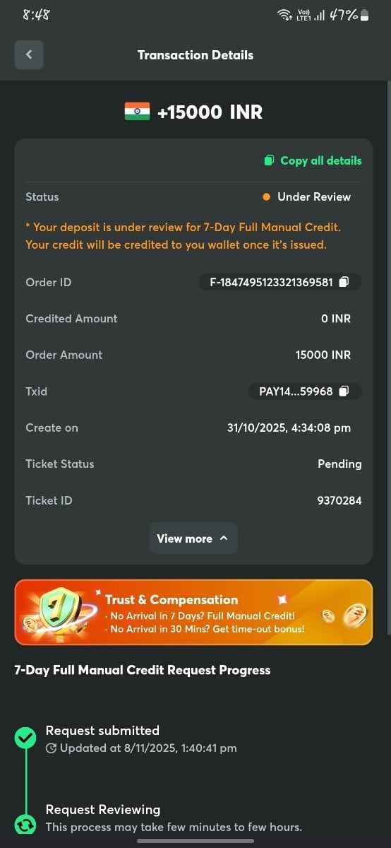 Please review my transaction manually and credit the deposit amount to my account, or process a refund if crediting is not possible. All data, screenshots, and video proof can be re-submitted if needed.