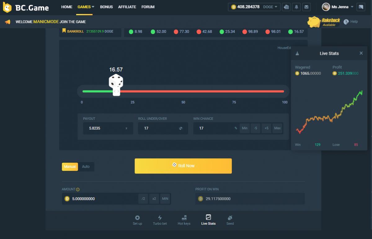 MsJenna-willis Posted August 12, 2020 Share Posted August 12, 2020 Hi guys so this strategy is easy you just need a small fixed bet for me its 5 doge. So here's how you do it you that white thing you drag to adjust the bet, what you are going to do it when the first bet you made goes to which ever number go to opposite by siwtching to the opposite side . [Example] 5.97 was the last number go to 94 don't need to be exact. if it goes to 25 drag it to 75. That's it enjoy playing classic dice. (i had 140 doge at the start now I'm at 246 doge not bad.) Try it and share how well it works for you. Link to comment Share on other sites More sharing options...