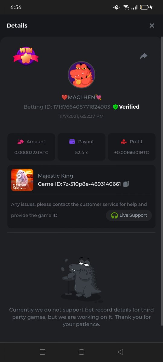 • In the same post, upload a screenshot of your win by clicking the game ID WITH VIEW IN USD mode ENABLED (accessible at the bottom of dropdown menu for your wallet up top. This way, we can ensure that your bet indeed met the minimum requirement at the time of placing it: