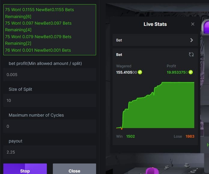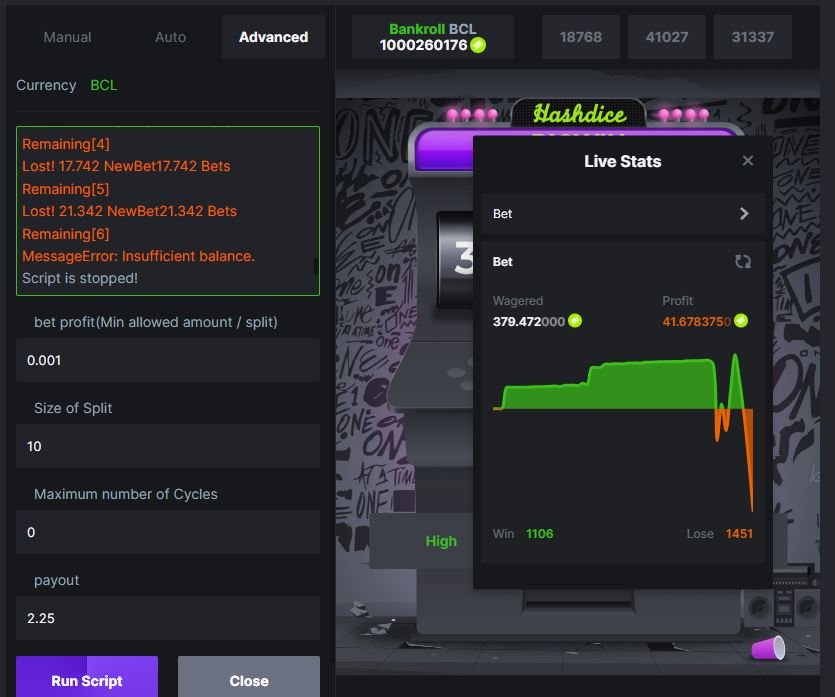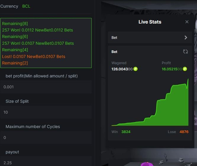 Advent Posted November 7, 2022 Share Posted November 7, 2022 Here is one of my favorite settings with this script - Minimum Bankroll: 20 units Bet Profit: 0.001 units Split: 10 Cycle: 120 Payout: 2.25x very volatile, but very fun if you win Link to comment Share on other sites More sharing options...
